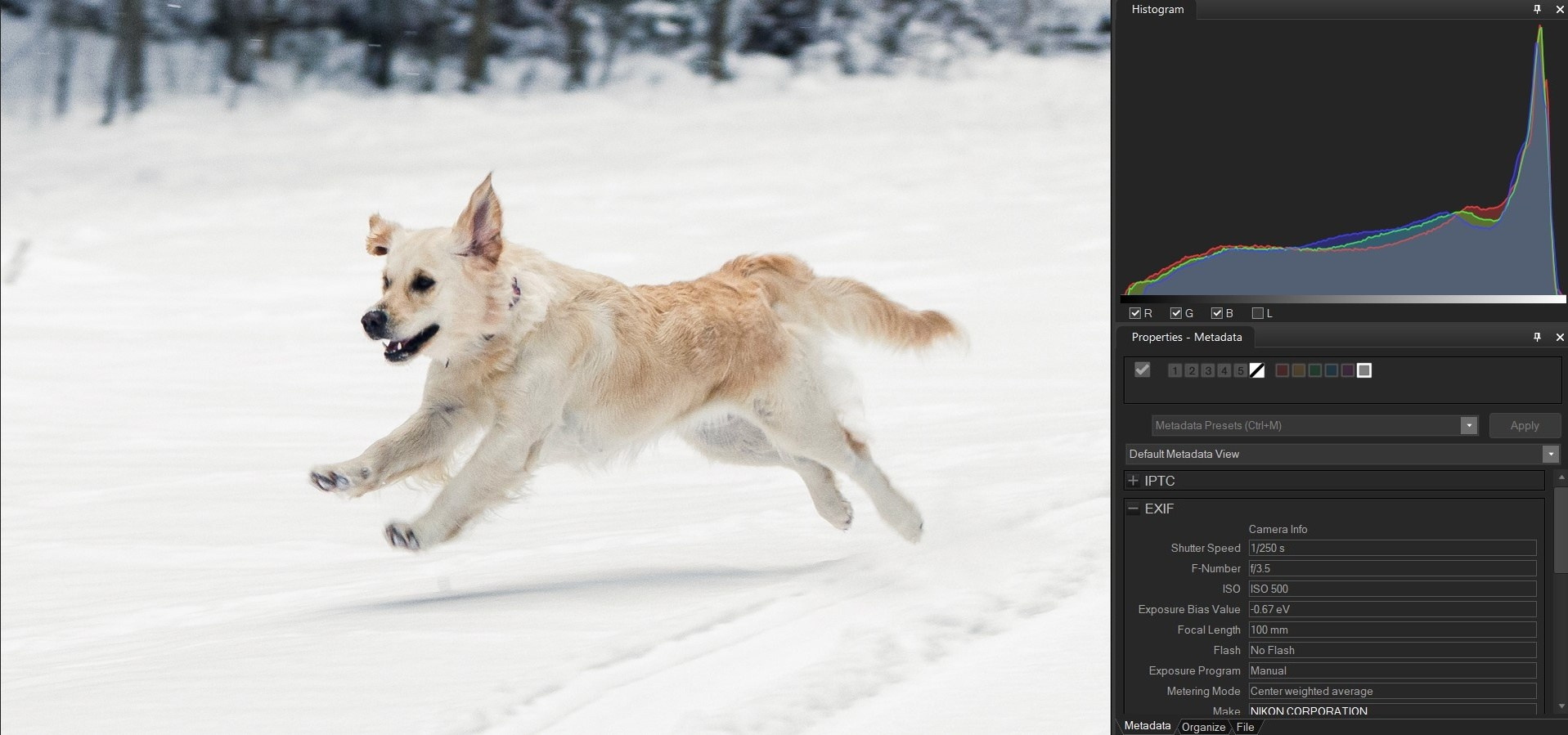 - Настройте экспозицию так, чтобы гистограмма максимально близко подходила к правому краю, но без пересветов (обрезания графика).